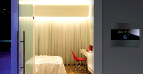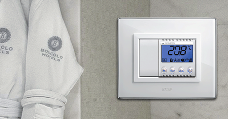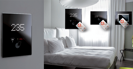 Le thermostat d'ambiance mesure la température ambiante et contrôle la régulation de la température d'une manière complètement personnalisable par le gestionnaire de l'hôtel avec diverses possibilités d'économies d'énergie.