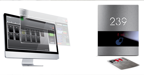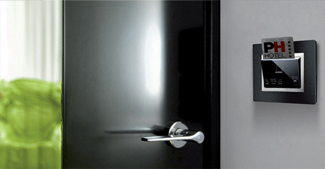 Les lecteurs extérieurs de porte permettent l'accès aux salles d'invité et aux autres salles de l'hôtel à différents niveaux d'autorisation personnalisables au moyen d'un transpondeur de carte. De différentes versions extérieures de porte, le Touch Vip System est le premier dispositif à être breveté avec un panneau tactile en verre et un lecteur de transpondeur.
