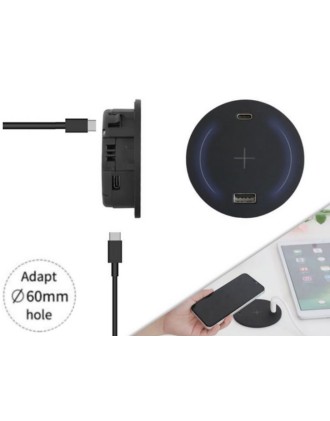 Œillet d'alimentation avec charge sans fil (15W, 110-200 KHz), chargeur USB (5VDC 3A), disponible en noir ou blanc, nécessitant une découpe de 60 mm.